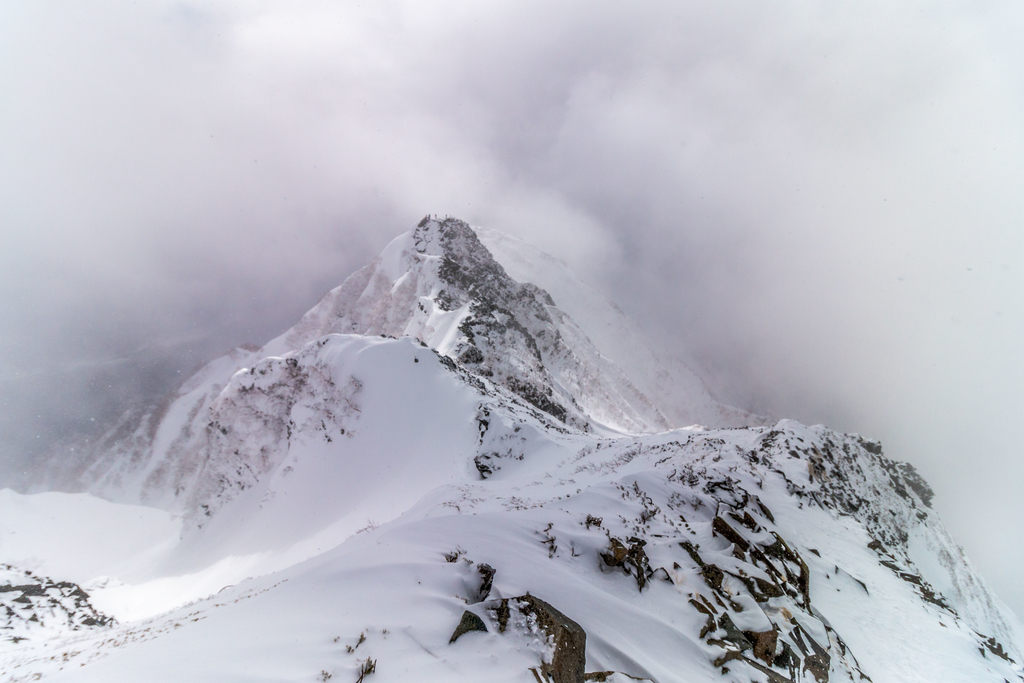 上半身は、樹林帯でftスキンメッシュ+ft厳冬期用ベースレイヤー+Marmotドライクライムで、下半身はOUTWETタイツ+メーカー不明冬パンツ。稜線に出てから上下シェルを重ねた。下半身の雑さがものすごい。自分に良いパンツを買ってあげたいけど、どうせ破くしアークテリリリリリクスの高級品とか買えない。高すぎて震えるわ。